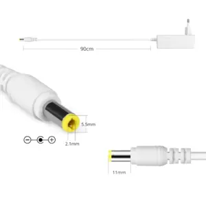 Strømforsyningen leveres komplet med en 90 centimeter lang ledning og et 5,5 millimeter DC stik, der gør tilslutningen hurtig og problemfri.