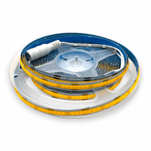 Prisvenligt COB LED Bånd i varm hvid lysfarve, som egner sig perfekt til brug som sekundær belysning, eksempelvis i og under skabe, møbler, hylder, osv.