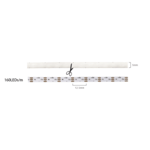 Båndet har 160 LED chips pr. løbende meter, og den matterede silikonestreng bidrager til et mere jævnt lys og glidende effekter.
