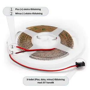 Der er monteret 15 centimeter ledning i hver ende af båndet med JST-hanstik med plus (+), minus (-) og data kabel (D0) i indgangs enden og blot plus (+) og minus (-) i den anden.