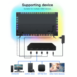 I praksis kører du dit HDMI kabel fra din TV boks, computer eller gaming konsol ind i den lille “sync box” og kører et HDMI kabel fra boksen til dit TV eller monitor, hvor fra at boksen registrerer hvad der foregår på skærmen og synkroniserer lysfarverne fra kanten af skærmen ud på væggen bag. Hver LED chip på det medfølgende LED strip styres digitalt af sync box’en og synkroniserer farven fra det specifikke skærmområde, så der skabes præcise farvegengivelser ud på væggen.