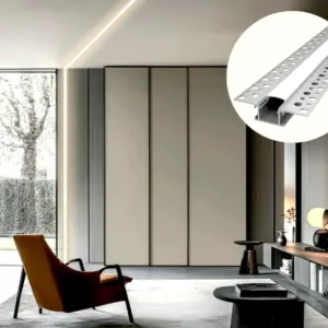 Komplet indmuringsprofil i anodiseret aluminium, som er produceret med henblik på indspartling i vægge og lofter.