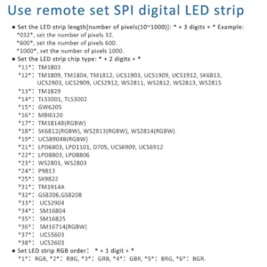| Kompatibel IC | TM1809, TM1804, TM1812, UCS1903, UCS1909, UCS1912, SK6813, UCS2903, UCS2909, UCS2912, WS2811, WS2812, WS2813, WS2815, SM16703P, TM1803, TM1829, TLS3001, TLS3002, GW6205, MBI6120, TM1814B (RGBW), SK6812 (RGBW), WS2813 (RGBW), WS2814 (RGBW), UCS8904B (RGBW), LPD6803, LPD1101, D705, UCS6909, UCS6912, LPD8803, PD8806, WS2801, WS2803, P9813, SK9822, TM1914A, GS8206, GS8208, UCS2904, SM16804, SM16825, SM16714D, UCS7604 (RGBW), SM16714 (RGBW), UCS2603, UCS5603, UCS7804 (RGBW) |